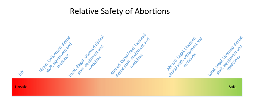 From the diagram above, Gibraltarians who seek abortions are mostly in the second category (from right to left) on the spectrum. They have access to relatively safe abortions, but to get these they need to travel to another country. The recent lockdown and other restrictions has somewhat changed this: they have had to either go abroad and possibly risk getting caught contravening the restrictions, or; they have had to go down the DIY route, the most dangerous route. This is dangerous because no abortion is risk-free (although the first category on the right in the diagram above has a mortality risk of 0.7%, a very low mortality rate, which is 14 times safer than carrying to term). Any complications would not be caught by a medical practitioner. There are various forms a DIY abortion could take: coat-hangers, crochet hooks, consumption of an excess of alcohol, punches to the stomach or other physical self-harm, obtaining pills from possibly unlicensed provider. All of those are potentially lethal. Even having access to abortions abroad poses a slightly higher risk than having the procedure done locally and legally. You can’t buy the Misoprostol and Mifepristone abortive pills nor have them at a clinic as these strictly provide only surgical abortions for non-residents.